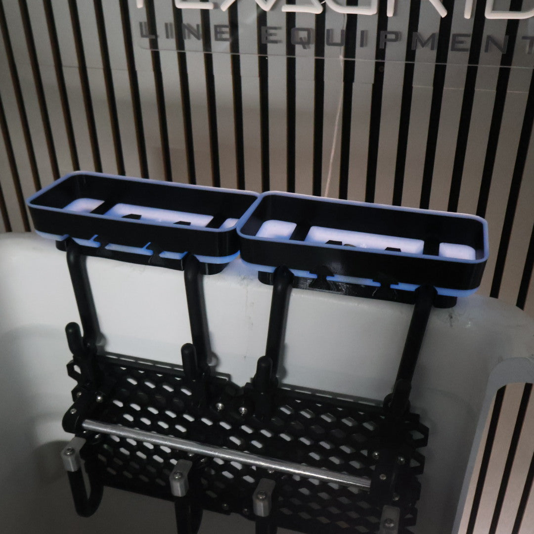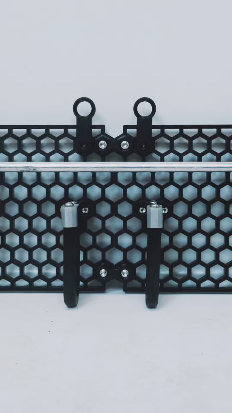 The Hexagrid Rigging Board consists of 4 deep hooks with flexible safety latches and a 16" aluminum bar. The hooks are deep and strong enough to hold multiple grips each, and the bar is capable of comfortably holding up to 6 hoists. The bar is spaced far enough away to hang multiple sized cutting tools and crimping tools.
